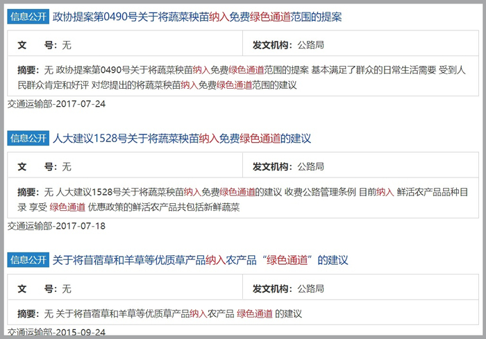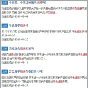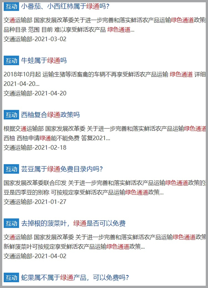 除此之外,交通部官网上还有诸多询问某些农产品是否属于绿通范畴,包括芸豆、韭黄、苕尖、鲜肉等。