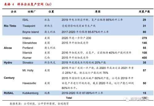 根据全球产能成本曲线可知,2300美元/吨以上的铝价,全球铝冶炼厂基本处于盈利状态,因此价格激励下的复产空间不容忽视。详细梳理了样本企业目前明确停产以及近期开工率运行偏低的产能情况,具备复产空间的企业主要有力拓、美铝和世纪铝业,合计复产空间在128万吨左右,量级上接近未来几年新建投放的水平。