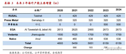 正如前文所述,隶属于发达国家的大型铝企在过去几年的投资建厂意愿表现低迷,导致未来3年冶炼新建(或扩建)的项目数量寥寥,通过公开资料以及海外咨询机构的整理的情况来看,未来产能增量仍集中在亚洲地区,除EGA、韦丹塔以及印度国家铝业旗下项目的继续扩建,重点新建项目主要有俄铝的Taishet铝厂、PressMetal的Samalaju铝厂二期项目(已于2020年底建成)以及华青铝业位于印尼的项目,合计贡献产能增量(2021-2024)在127万吨左右,产能增量较过去(2017-2020)的137万吨基本持平。