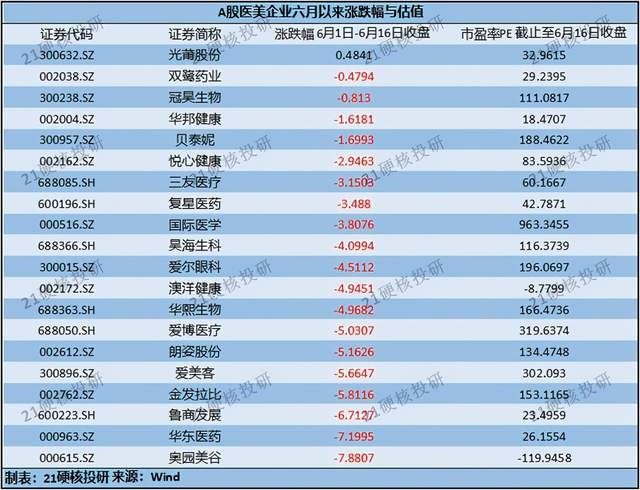 截至6月16日收盘,Wind医疗美容指数成分内,20家A股上市企业,有19家从六月初至6月16日最新收盘日股价出现下跌,市盈率过百倍的企业依然有10家。