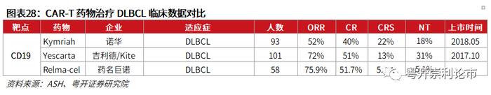 Yescarta作为五款已上市的CAR-T疗法之一,疗效和安全性得到验证。我们预计Yescarta在国内的上市之路将十分顺利,从先前披露的临床数据看,Yescarta总ORR达83%,CR达58%,较传统化疗方法显著延长了患者的OS,有望为晚期DLBCL患者提供新的用药选择。