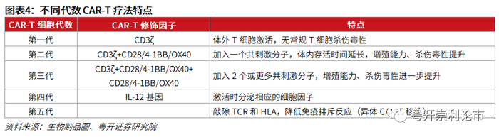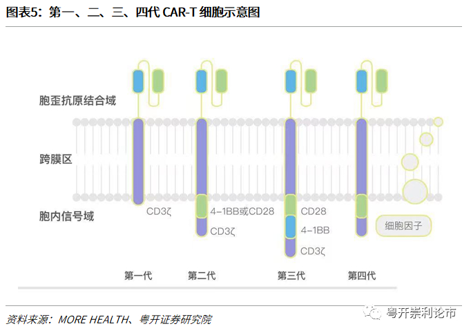 CARs根据其胞内共刺激结构域域可分为五代,但上市的CAR-T细胞疗法普遍为二代CAR-T: