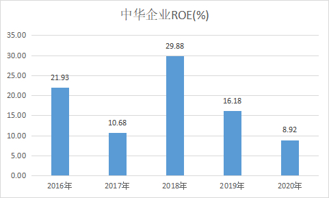 因为重组的关系,近几年公司平均ROE走势犹如过山车。2018年达到峰值29.88%后随即连续2年下滑至8.92%,处于行业中下游水平。公司总资产增厚后周转率不断下行,归母净利下滑明显再加上超低的杠杆率拉低ROE,可见中华企业整体战略过于“保守”。