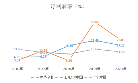 中华企业过去几年净利润率先升后降,从2016年的6.25%提高至2019年的21.68%,2020年跟随大市下跌,下滑了4.5个百分点至17.17%。截至2020年该指标排在行业41位,处于中上位置。在规模相当的房企中同样是中等水域,高于广宇发展,低于阳光100中国。