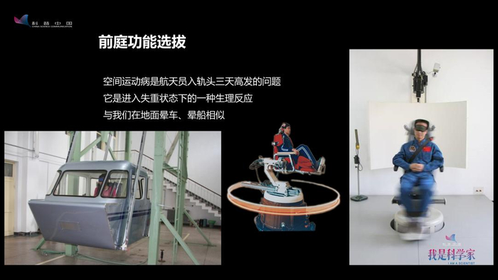 举个例子,比如“前庭功能”的选拔。航天员入轨之后,进入太空之后的头三天,是空间运动病高发的时候。“空间运动病”其实不是病,它是人在失重环境下的一种特殊的生理反应,和我们在地面上的“晕车”或“晕船”的反应类似。人进入太空之后,因为这种反应,可能会觉得会头晕目眩,严重时会呕吐。