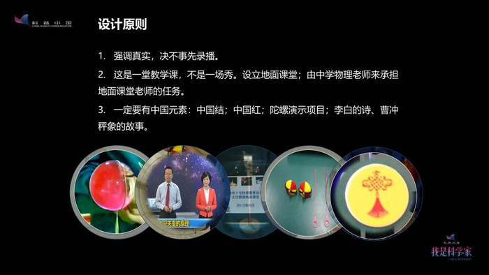 第三条坚持的原则就是:一定要有中国的元素。比如,航天员在做了水膜之后,上面放置了一个小贴片,设计师最早给这个小贴片设计的图案是一个笑脸,后来我说,我们得用中国结;包括水膜做成水球的颜色,也选了中国红,虽然其他颜色在试验中也很漂亮;另外,还有“陀螺演示”项目,除了陀螺本身是在航天技术中广泛应用的元素,制导或导航都要用到陀螺,而且陀螺的定轴性的演示只有在太空能真实地演示,地面也做不到(这个录像现在已经成了专业教学的一个教学片),还有一个很重要的原因就是陀螺是我们很多人(尤其是男孩子们)小时候都会玩的一个玩具,这也是有中国特色的;此外,还包括太空老师的选用李白的诗、曹冲称象的故事,也都是出于体现我们中国元素的考虑。