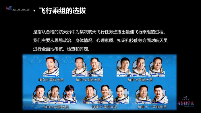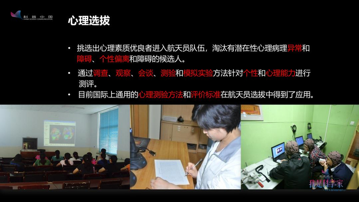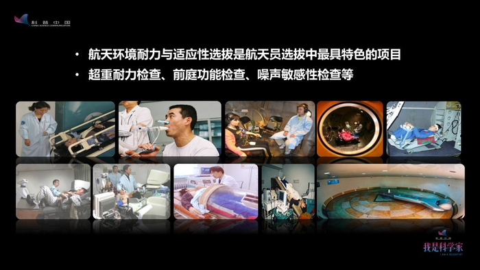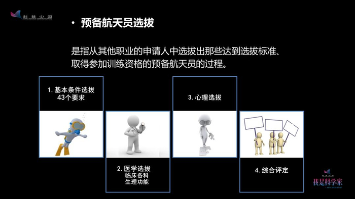 预备航天员的选拔涉及基本条件、医学、心理选拔以及综合评价等四个方面。基本条件,包括年龄、身高、教育背景、职业背景等43个方面的要求。医学的选拔包括临床各科检查,以及生理功能的检查,比如用跑台做运动心肺功能检查以及航天环境耐力和适应性的检查。