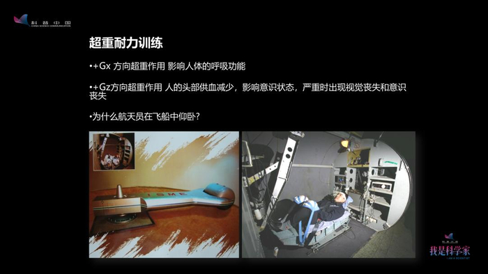 除了用离心机,我们还要做呼吸对抗动作的训练,让航天员掌握腹式呼吸。平常我们都是用胸式呼吸,胸背向的超重作用主要是影响呼吸功能,所以你要学会腹式呼吸来对抗,然后还要进行腹肌力量的训练,这样的话耐力能提高1到2个G。
