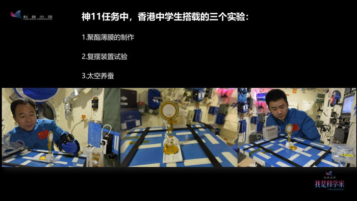 “神十一”上还搭载了3个香港中学生设计的实验,分别是聚酯薄膜的制作、复摆装置和太空养蚕实验。这3个实验是从香港中学生的70个项目中挑出来的。