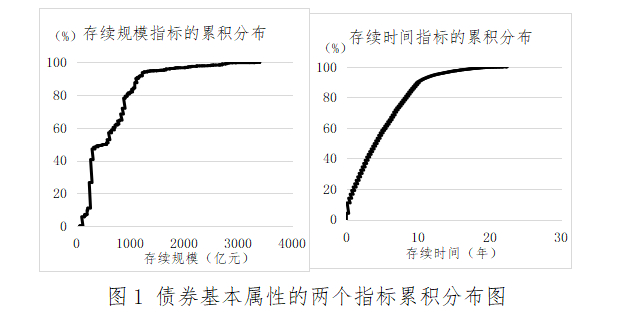 在债券基本属性因素中,存续规模、存续时间是国债流动性研究中较为常用的因素,在本文的研究中将进行验证。在该部分研究中,为更加精细地观察各指标的影响,将一只债券在不同月份上的数据当成不同的实证样本,以月度为频率统计流动性衡量指标的均值。债券基本属性指标的描述性统计及分布图如表4和图1所示。