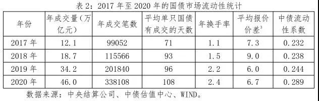 从上述六个流动性衡量指标的统计来看(见表2),近三年我国国债流动性逐年提升,2019年以来国债市场流动性提升明显。2020年,国债年交易量达46万亿元,较上年增长了35%;年成交笔数达34万笔,较上年增长了70%;平均单只债券有成交的天数为108天,较上年增长了13%;年换手率达2.4,较上年上升了9%;中债流动性系数为0.289,较上年上升了18%。
