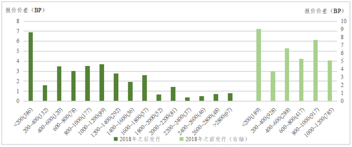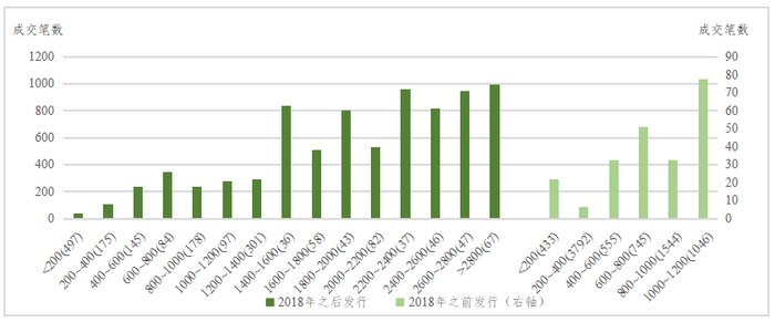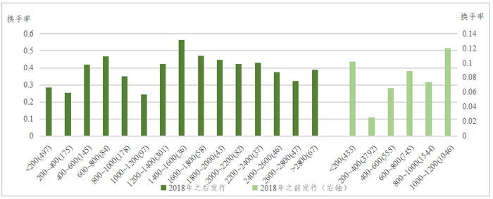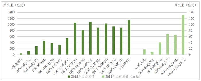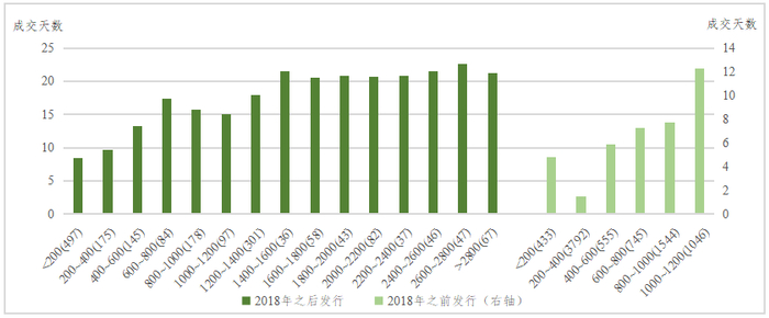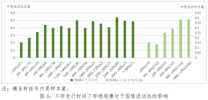 在上述统计分析中,每个分组中债券的新旧程度并不是均匀分布的,例如最后两个分组(“1200~1400”和“>1400”)的债券均为2018年之后新发行的债券,而其他分组的发行时间跨度为1998年~2020年,这是由于2018年之后财政部加大国债的发行力度、国债发行规模上升,因此规模较大的国债大多集中在2018年之后。为了剔除发行时间的影响,更加精细地观察规模对流动性的影响,按照债券是否是在2018年之后新发,进行分别统计,如图3所示。统计结果仍然显示国债的存续规模与国债的流动性正相关。