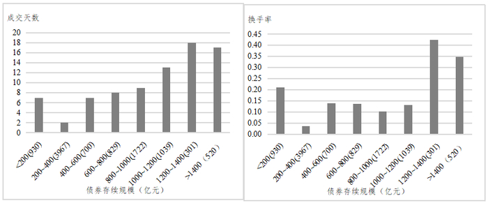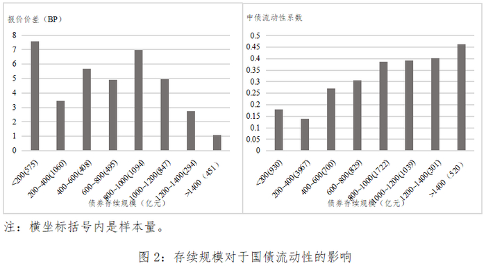 由图2可以看出,随着存续规模的增长,成交量、成交笔数、成交天数、换手率、中债流动性系数基本呈现上升趋势,报价价差是逐渐递减,表明国债存续规模越大国债市场越有深度和宽度、交易的即时性也越好,反映国债流动性越充足。主要原因是由于债券存续规模越大、持有主体越多,交易也越容易,而规模小的债券,持有主体需要付出更多信息成本,要求更高流动性补偿(Crabbe&Turner(1995))。