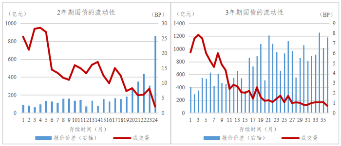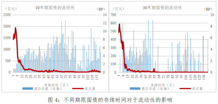 1、国债流动性与债券存续规模正相关。图2根据存续规模对国债进行分组,统计每个分组内国债流动性指标的月度均值。