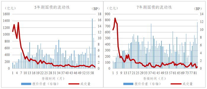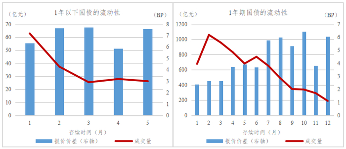 各流动性衡量指标的结论基本一致,由于篇幅限制,正文仅展示成交量和报价价差两个指标结果。从成交量等大部分流动性指标来看,总体上国债流动性随着存续时间的增大而降低,对于1、2年的中短期债券,流动性在新发行3个月左右流动性达到最佳后逐渐降低;对于3年及其以上的中长期债券,3、5、7、10年期债券在新发行后流动性快速提升,新发行6个月左右到达顶峰后逐渐降低。主要原因一是债券存续时间越长,越高比例的个券退出流通而进入持有到期型投资者的投资组合,因此个券流动性随着已存续时长而递减(Sarig&Warga(1989));二是国债新发行后一段时间内会有续发行操作,通过多次续发刺激市场、提高单只债券的规模,达到提升流动性的目的。