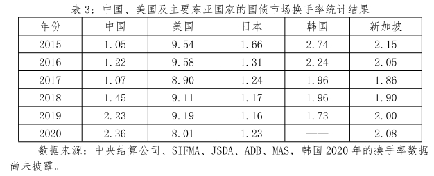 以换手率指标来衡量,我国国债市场的流动性与美国市场的差距在逐渐缩小,已超过日本、韩国、新加坡的水平。