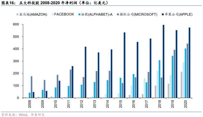 从长期的盈利能力上看,五家头部科技公司2020年的净利润均大于200亿美元,且盈利水平均在持续增长。其中,苹果净利润最高,为574亿美元,较2019年上涨3.9%。谷歌和微软均实现400亿美元以上的净利润,增速分别为12.84%和17.26%。FACEBOOK和亚马逊同样实现了200亿美元以上的净利润,其中亚马逊的净利润增速在五家科技巨头中最高,为84.08%。综合来看,这五家代表性科技公司均具备较强的盈利能力和一定的成长能力。
