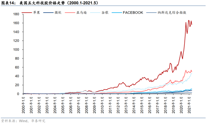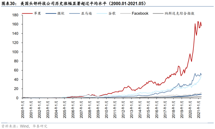 美国科技股的头部效应在FAAMG(苹果(APPL US)、亚马逊(AMZN US)、谷歌(GOOGL US)、微软(MSFT US)以及FACEBOOK(FB US))五大科技巨头中体现的更加明显。在2000年到2021年的二十余年间,五大科技股的涨幅均显著超过纳指。其中苹果公司股价增长超过156倍,亚马逊股价增长50倍,谷歌股价增长46倍,FACEBOOK股价增长11倍,微软公司股价增长8倍,而同期标普500指数点位增加3.49倍,涨幅显著低于头部科技股。