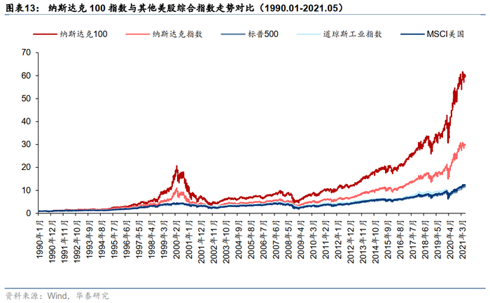 从美国市场的长期发展经验来看,科技股中头部效应显著,高市值的头部公司相对中小市值科技股具有更高的长期收益。截止2021年5月31日,美国五家头部科技公司苹果(APPL US)、微软(MSFT US)、亚马逊(AMZN US)、谷歌(GOOGL US)以及FACEBOOK(FB US),总市值分别为2.08万亿、1.88万亿、1.63万亿、1.58万亿和0.93万亿美元,总市值约为8.097万亿美元,占纳斯达克交易所全部股票总市值25.791万亿美元的31%。五家公司自2000年1月至今平均年化收益率为22.54%,显著高于纳斯达克综合指数6.01%的年化收益率。