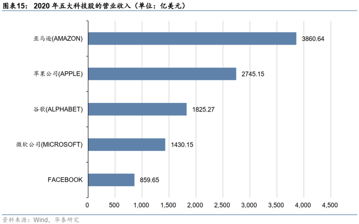 为探讨美国优质科技股的共性,我们对FAAMG的重要财务指标进行观察,从营业收入上看,亚马逊和苹果公司2020年营业收入均在2500亿美元之上,其中亚马逊以3860.64亿美元的营收大幅领先,谷歌和微软公司的营业收入均高于1000亿美元,FACEBOOK的营收也达到了859.65亿美元。整体上看,该五家头部科技公司均具有较高的营业收入、较大的经营规模和较大的市场份额。