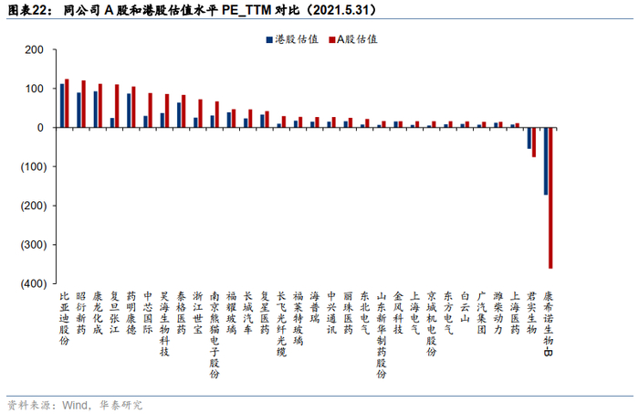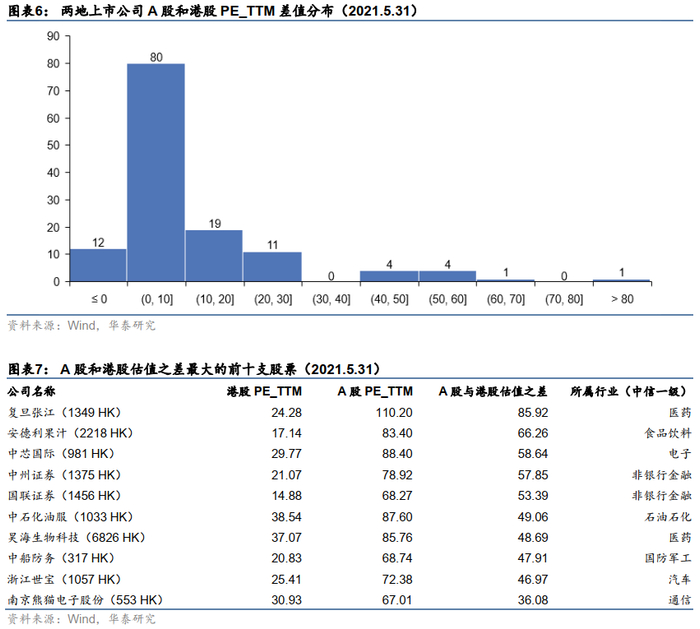 在132家A股港股两地上市的公司中,仅有12家公司的A股估值低于港股估值,余下120家公司中,又有40家公司的AH股估值差在10以上,A股整体估值的绝对值明显高于同公司港股估值的绝对值,同一家公司在港股的价格明显更有竞争力。将同公司A股和港股的PE(TTM)作差并排序,估值差最大的前十支股票,主要来自电子通信、汽车、医药等高科技行业。