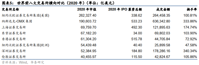 2020年,港交所成交金额共4.47万亿美元,在世界前八大交易所中位列第六,显著低于IPO募资额相近的上交所的12.19万亿美元;港交所换手率为73%,显著低于上海证券交易所的175%、伦敦证券交易所的106%和东京证券交易所的104%。可见港交所的交易热度落后于世界其他证券交易市场,然而IPO速度却排名靠前,相比其他市场,股市中资金被稀释的程度更高,因此估值也相对更低。