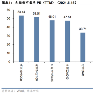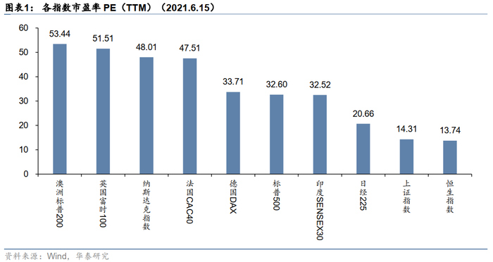 与全球主要股票市场指数相比,恒生指数当前估值相对较低。我们将中国香港恒生指数、A股上证指数、美国标普500和纳斯达克综合指数、英国富时100、法国CAC40、德国DAX、澳洲标普200、日本日经225和印度SENSEX30等股指的PE_TTM展示在同一张图表中进行比较。截止2021年6月15日,澳洲标普200指数PE_TTM最高,为53.44倍;英国富时100指数次之,为51.51倍;美国、德国、法国、印度市场指数的PE_TTM也均超过30倍,而恒生指数的PE_TTM仅为13.74倍,估值水平为上述指数中最低。