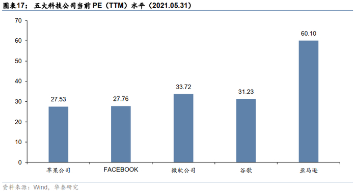 从估值上看,五家代表性科技公司的估值处于科技股中的合理水平,其中亚马逊估值最为突出,PE_TTM为60.10倍;其余四家公司的估值均低于纳斯达克指数成分股的平均市盈率,处于科技股中正常偏低的水平。