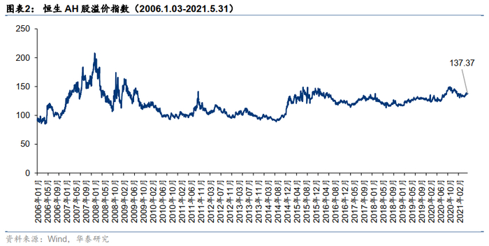 接下来我们采用恒生AH股溢价指数来直观观测A股相对H股的估值水平,指数点位越高代表A股相对H股的溢价越高。截至2021年5月31日,恒生AH股溢价指数点位为137.37,意味着A股相比H股有37%左右的溢价,单从估值角度来看,港股相对A股或具有更高的投资性价比。