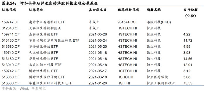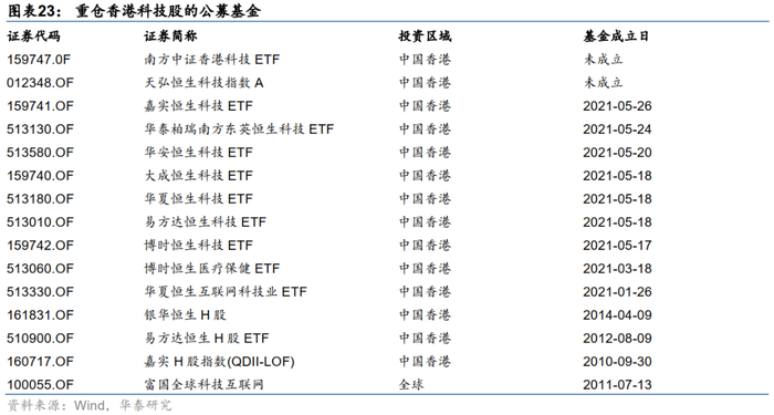 考虑到主动型基金名称和投资区域不一定代表其实际投资方向,我们通过基金前十大重仓股来筛选实际投资方向为港股科技行业的基金。我们将筛选条件设定为:第一重仓股为香港科技股,且2021年一季报中公布的前十大重仓股中至少包含5只及以上的香港科技股,并对所有QDII基金进行检验。
