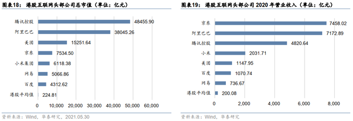 这些经营范围主要集中在大陆的互联网巨头和优质新经济公司,在港股市场中也颇受投资者认可。市值方面,上述七家公司市值均达到4000亿元,显著超过港股224.81亿元的平均市值。其中腾讯控股总市值已接近4.85万亿元,位列互联网巨头公司榜首;阿里巴巴市值超过3.8万亿元;美团也已突破1.5万亿市值。营业收入方面,2020年京东和阿里巴巴总营收均突破7000亿元,分别为7458.03亿元和7172.89亿元。腾讯、小米、美团和百度营收规模均在1000亿元以上,网易736.67亿元的营业收入也显著超过港股平均水平。