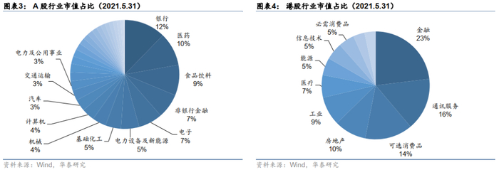 港股以金融、房地产等低估值行业为主。从各行业上市公司总市值占比上看,A股市值占比前三的行业分别是银行、医药和食品饮料,占比都在10%左右,电子、电力设备及新能源等高科技高估值行业市值占比也较大。反观港股的行业构成,低估值金融行业市值占比达到23%;通讯服务排名第二,为16%,可选消费品第三,为14%;房地产行业占比位列第四,为10%。金融行业和房地产行业属于低估值行业,其较高的市值占比压制了港股整体估值。