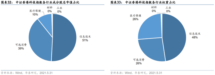 从行业角度来看,根据Wind行业分类,港股科技指数成份股主要来自信息技术、医疗保健、可选消费、材料、工业五大行业。下方三张图表中分别展示了中证香港科技指数各行业成分股总市值、行业实际权重与各行业成分股总数。从图表中可以清晰的看出,信息技术行业在成分股数量、总市值以及权重方面均占据半壁江山;可选消费行业成分股仅包括阿里巴巴-SW(9988 HK)、美团-W(3690 HK)、京东集团-SW(9618 HK)和京东健康(6618 HK)四只成分股,数量虽少总市值占比却接近40%,而在指数构建中,该行业权重却被压缩至26%;医疗保健行业的总市值占比仅为10%,在指数中的权重却被扩展到了25.5%,可见中证香港科技指数倾向于给医疗行业港股赋予更高的权重。
