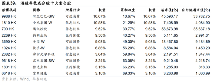 接下来我们调取了中证香港科技指数的前十大成分股,其中包括阿里巴巴-SW(9988 HK)、小米集团-W(1810 HK)、腾讯控股(700 HK)、药明生物(2269 HK)、美团-W(3690 HK)、快手-W(1024 HK)、舜宇光学科技(2382 HK)、京东集团-SW(9618 HK)、信达生物(1801 HK)以及京东健康(6618 HK)共10只股票。这十大重仓股的共同特点包括:①总市值均在千亿以上;②主要业务在国内,属于知名度很高的科技行业龙头;③大部分未在A股上市。