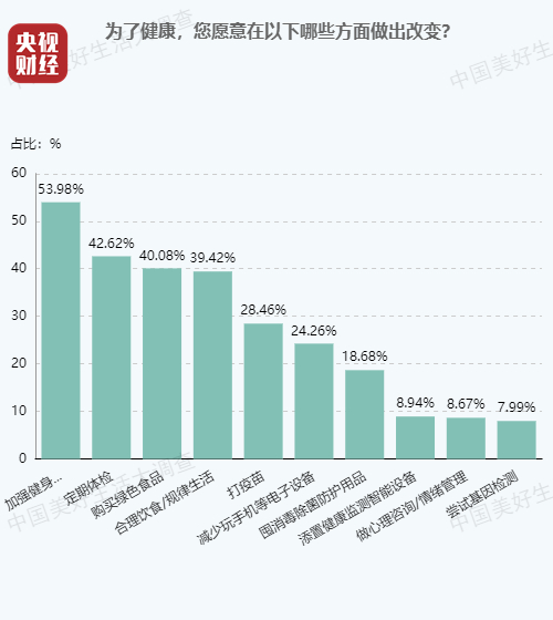 大调查发现有超过半数的人,为了健康愿意加强健身运动。有四成左右的人为了健康,愿意定期体检、购买绿色食品以及合理饮食/规律生活。看来,加强健身运动是大家认可的、获得健康的主流方式。