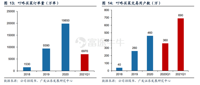 拥有庞大活跃用户群体,2020年总订单量近两亿单。据公司招股书,2020年叮咚买菜全年总订单量为1.985亿单,2021年一季度总订单量达6970万单,整体呈上升趋势。用户规模方面,公司2021年一季度平均月交易用户数为690万,去年同期为360万,同比实现大幅增长。