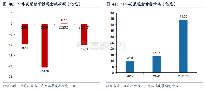截止2021年3月,公司员工总数达到3098人,其中1320人为产品开发人员,占总员工的43%。公司现处于扩张期,资金需求仍大,前置仓网络布局、供应链系统完善、产品开发等均需持续投入。据公司招股书,叮咚买菜本次IPO募集资金的50%将用于提高其现有市场的渗透率,并开拓更多新市场,除此,募资30%用于增强叮咚买菜在上游的采购能力,约10%募资用于增强其科技及供应链系统。
