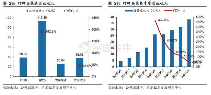 营业收入高速增长,疫情之后增速有所放缓。根据公司招股书,叮咚买菜营业收入从2019年的38.8亿元增至2020年的113.4亿元,同比增长192.2%,2021年一季度同比增长46.0%。