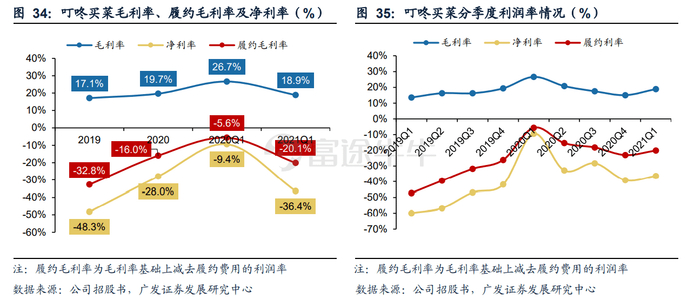 履约费用增长提速,净利润亏损扩大,亏损率收窄。2020年及2021年一季度,公司营业成本同比增速分别为183.2%、61.4%,履约费用同比增速分别为61.4%、76.4%,履约费用增长提速。叮咚买菜亏损额从2019年的18.73亿元扩大至2020年的31.77亿元,亏损率从48%收窄至28%,公司正处于市场开拓期,短期或持续增加投入。
