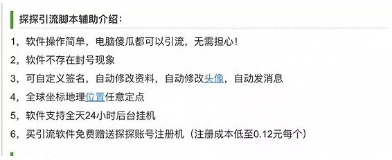 据了解,一些电商平台会提供探探的一系列软件脚本服务,价格从几十元到几百元不等,一个账号可以导流300多个客户。还有探探的分身服务,一个手机能最多开七个探探的分身。