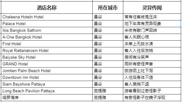 带着溯本求源的态度,我把所有能搜到的闹鬼酒店列了个Excel,发现几乎包揽了泰国各个旅游景区。