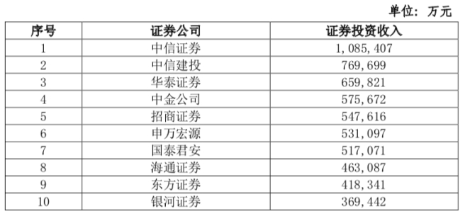 中信证券的证券投资收入规模比上一年度上一个台阶,是唯一一家超过百亿的券商,为108.54亿元;中信建投排名第2,为76.97亿元,相比2019年上升8名;中金公司以57.57亿元排第4,排名上升7位;东方证券排名第9(41.83亿元),前进了5个名次。
