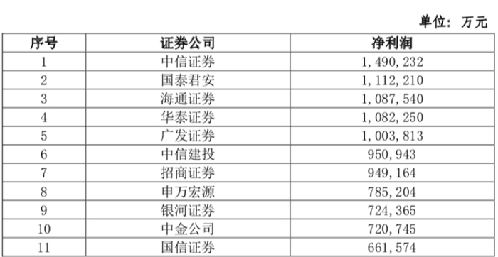 中金公司净利润排名再次挤进前十,以72.07亿元排在第十位,这次被挤出的是国信证券,该券商以66.16亿元净利润排在第11位。