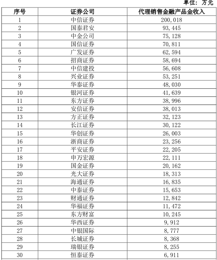 具体来看,中信证券2020年代销金融产品收入为20亿元,暂时排名第一;国泰君安在2019年排名仅11位,在奋力前追后,2020年猛然上升至第2名,代销收入为9.34亿元。