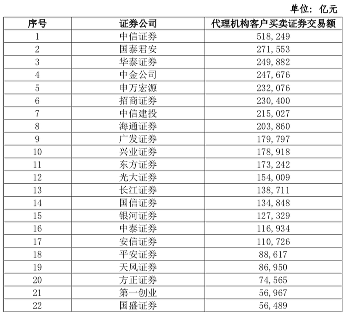 根据中国证券业协会数据显示,2020年度“代理机构客户买卖证券交易额”排名中,前五名位置与2019年相比没有变化,依次为中信证券(51.82万亿元)、国泰君安(27.16万亿元)、华泰证券(24.99万亿元)、中金公司(24.77万亿元)、申万宏源(23.21万亿元)。