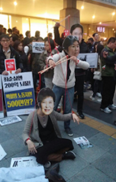 2016年,韩国爆发反朴槿惠运动(烛光革命)。倒朴运动期间,最大的议题是朴与三星财阀之间的官商勾结,交易数字堪称天文数字。所以当时大家要求朴槿惠下台,并逮捕三星副会长李在镕。当年11月,SHARPs发表《时局宣言文》:“朴槿惠-崔顺实-三星财阀的数百亿官商勾结是数百名在三星工作、生病死去的劳工的血泪!朴槿惠下台!”