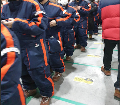 但是,coupang并没有遵守政府规定的防疫措施。工人在排队领餐时,没有遵守保持1米以上距离的规定。我们去调查的富川物流中心主要在处理冷藏食品,是一个不通风的密闭环境;即使是5月,也要穿防寒服和厚重的鞋子。但是这些衣服和鞋子竟然是工人共用的。在来回交通车、电梯、餐厅和更衣室等地方,工人完全没有保持安全距离。这样的劳动条件很容易造成交叉感染,实际上,在共用防寒衣和手套上检测到了新冠肺炎病毒。