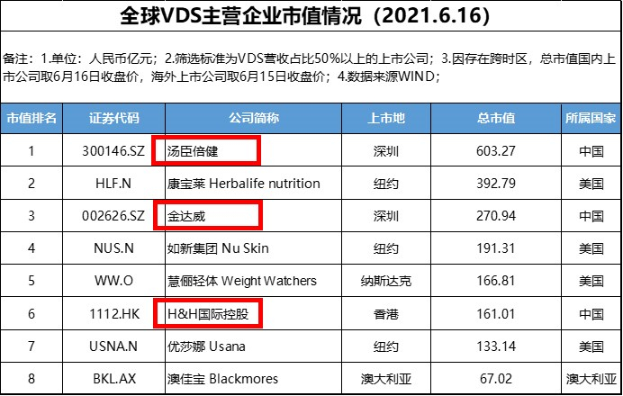 同时,全球范围内市值排名前八的VDS主营企业中,有3家来自中国, 4家为美国公司,第8位为澳洲公司。单从市值这一维度比较,在上榜企业中,以汤臣倍健为代表的中资企业总市值已超过海外公司。