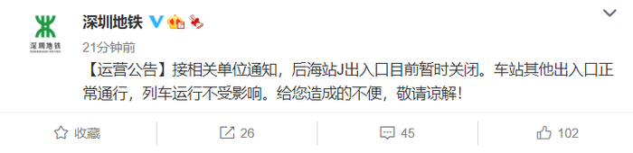 6月18日,据深圳地铁官方微博消息,接相关单位通知,后海站J出入口目前暂时关闭。车站其他出入口正常通行,列车运行不受影响。