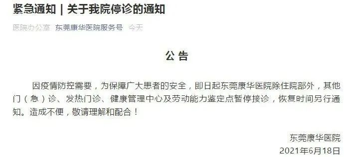 18日东莞康华医院发布紧急通知:因疫情防控需要,为保障广大患者的安全,即日起东莞康华医院除住院部外,其他门(急)诊、发热门诊、健康管理中心及劳动能力鉴定点暂停接诊,恢复时间另行通知。造成不便,敬请理解和配合!